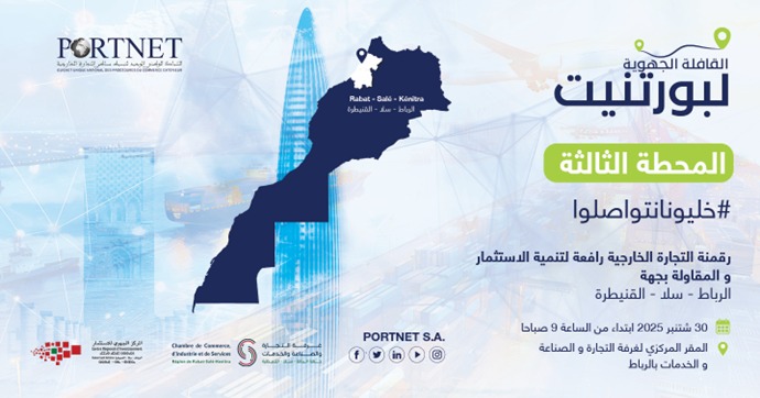 في إطار استراتيجيتها الوطنية القائمة على سياسة القرب من الفاعلين الاقتصاديين، تنظم شركة بورتنيت المحطة الثالثة من قافلتها الجهوية بجهة الرباط – سلا – القنيطرة، وذلك بشراكة مع غرفة التجارة والصناعة والخدمات للجهة، والمركز الجهوي للاستثمار، والمندوبية الإقليمية للتجارة والصناعة بالرباط.